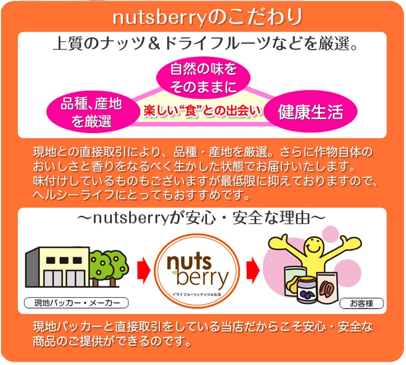 また、nutsberryというショップは上質のナッツ&ドライフルーツを厳選して使用。安心・安全な商品を販売している優良店なのです。